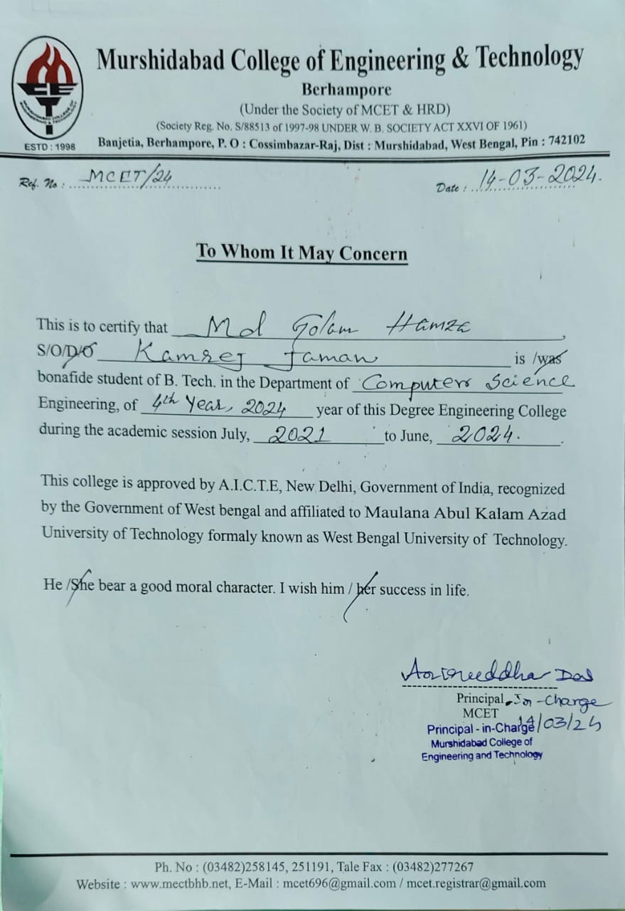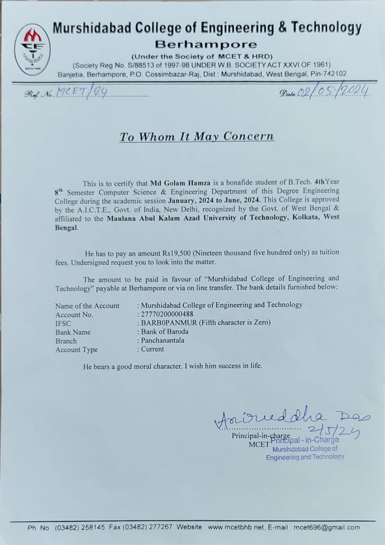 Our family has faced severe economic hardships, exacerbated by my brother's recent bike accident, which necessitated costly brain surgery at NRS Hospital. To fund his treatment, we were forced to sell our home, leaving us in a dire financial situation. Despite our struggles, I have persevered in my studies, currently pursuing my 3rd Year 6th Semester B.Tech in Computer Science & Engineering at Murshidabad College of Engineering & Technology, with a commendable 91% marks.