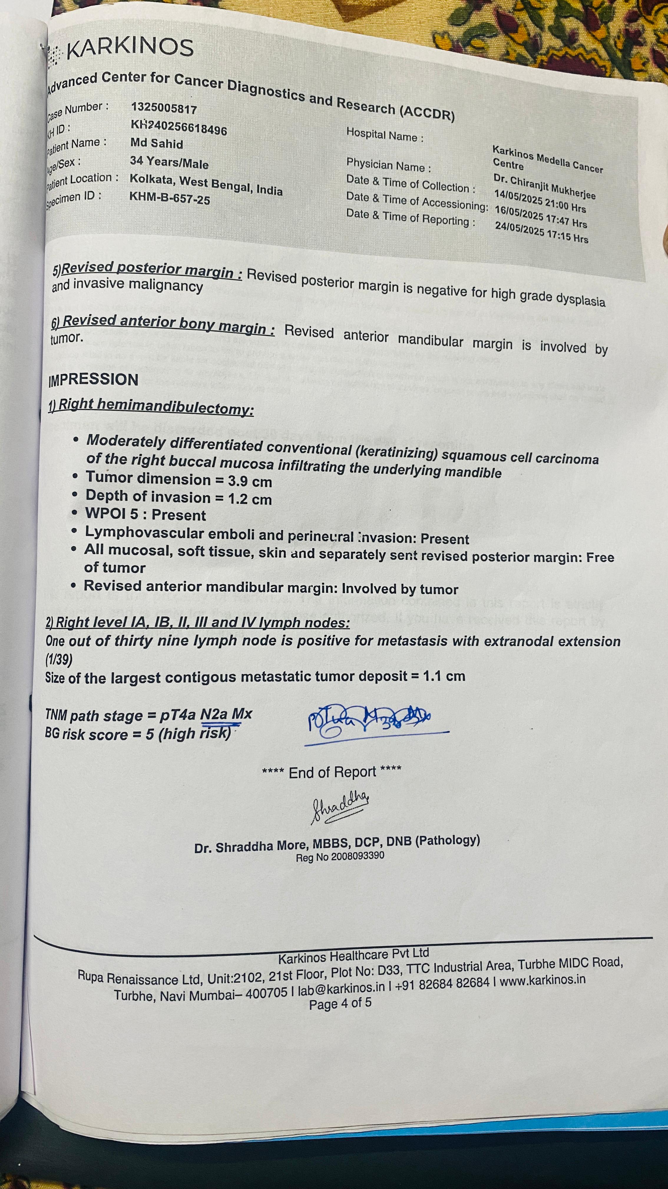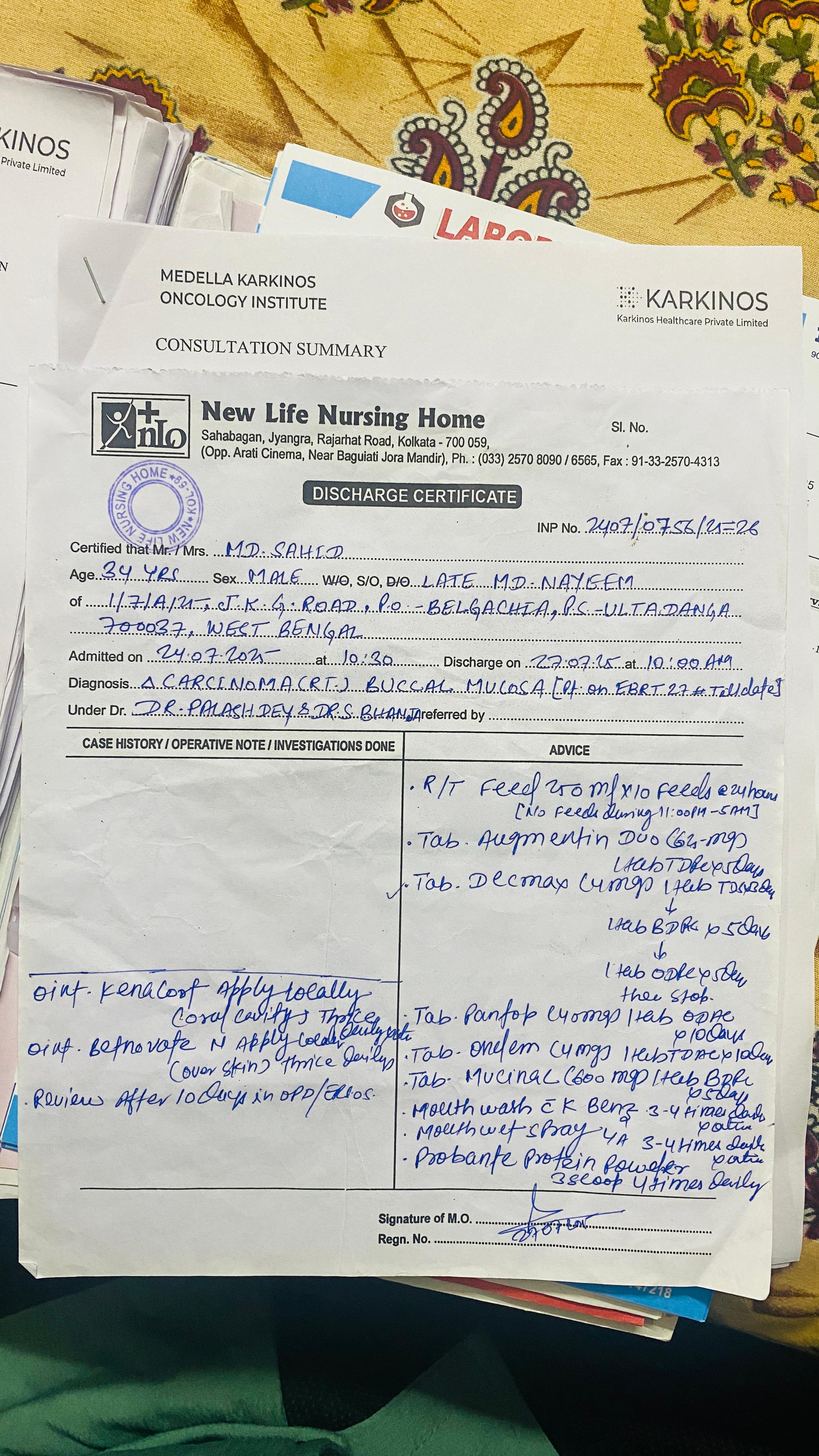 Brother Shahid has reached such a stage with his mouth cancer that we are just hoping for a miracle. He is in extreme pain & agony . Regular chemotherapy is the only means for palliative care .
