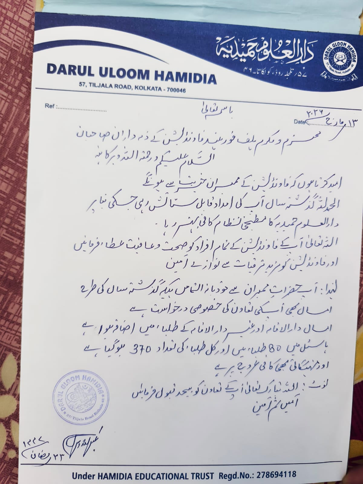 Alhamdulillah around 370 students are seeking deeni-taaleem at this madrasa. 80 students are full time hosteliers.Except a few from well-off families maximum students are from poor background whose lodging & fooding is maintained by the madrasa. Plz donate generously for this madarsa